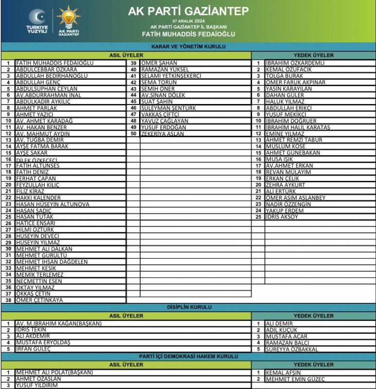 AK Parti Gaziantep İl Başkanı Fatih Muhaddis Fedaioğlu, düzenlediği basın toplantısıyla icra kurulu üyelerini kamuoyuna açıkladı.