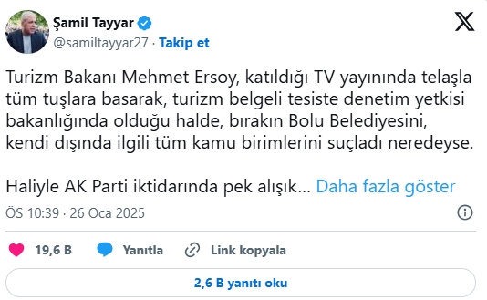 Bolu İl Özel İdaresi’nin ‘denetim Turizm Bakanlığı’nda’ açıklaması sonrasında sosyal medya hesabında bir açıklama yapan AKP li Şamil Tayyar,” Turizm Bakanı artık AK Parti için taşınması ağır bir yüktür” dedi