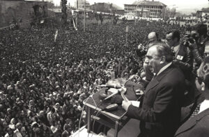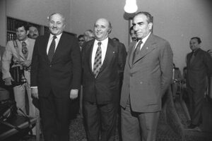 Hükûmeti kurmakla görevlendirilen AP Genel Başkanı Süleyman Demirel (ortada), Milli Selamet Partisi (MSP) Genel Başkanı Necmettin Erbakan (solda) ve Milliyetçi Hareket Partisi (MHP) Genel Başkanı Alparslan Türkeş (sağda), 10 Temmuz 1977’de TBMM’de bir araya geldiler.