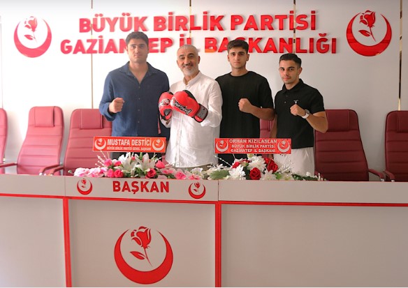 Büyük Birlik Partisi (BBP) Gaziantep İl Başkanı ve MKYK üyesi Orhan Kızılaslan, sporun ve sporcunun yanında olduğunu bir kez daha göstererek, Muay Thai ve Kick Boks alanında ülkemize büyük gururlar yaşatan sporcuları ağırladı. Avrupa şampiyonu Enes Bilben ve Ali Bilben ile birlikte, 9 kez Türkiye Şampiyonu olan Ferizon Gocuk ve diğer başarılı sporcular, BBP İl Başkanı ve MKYK üyesi Orhan Kızılaslan’ı BBP Gaziantep İl Başkanlığında ziyaret etti.