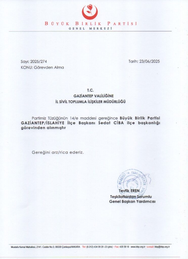 Genel Merkezin 23.06.2025 tarih ve 2025/274 sayılı Gaziantep Valiliği İl Sivil Toplumla İlişkiler Müdürlüğüne gönderilen yazı da “Parti Tüzüğümüzün 14/e maddesi gereğince Büyük Birlik Partisi Gaziantep/İslahiye ilçe Başkanı Sedat Ciba İlçe Başkanlığı görevinden alınmıştır” denildi.