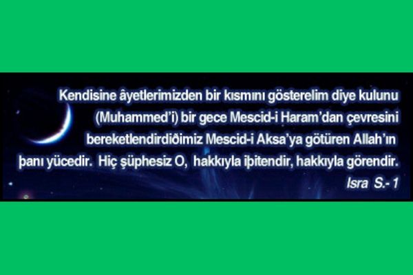 “Âyetlerimizden bir kısmını ona göstermek için kulunu bir gece Mescid-i Haram’dan alıp çevresini mübarek kıldığımız Mescid-i Aksâ’ya seyahat ettiren Allah, her türlü noksandan münezzehtir. Şüphesiz ki O her şeyi hakkıyla işiten, herşeyi hakkıyla görendir.” (İsra Suresi, 1)