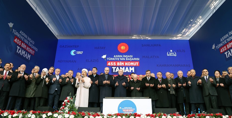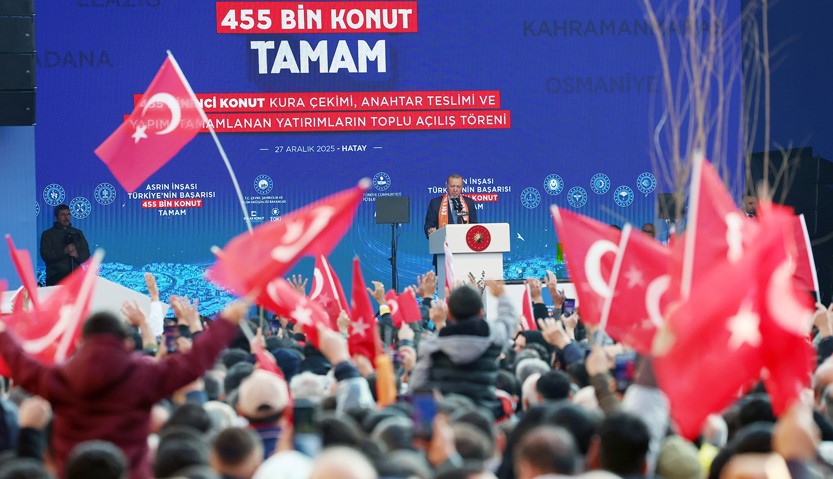 Cumhurbaşkanı Erdoğan, Hatay’da “455 Bininci Afet Konutu Kura Çekimi, Anahtar Teslimi ve Yapımı Tamamlanan Yatırımların Toplu Açılış Töreni”nde yaptığı konuşmada, “Bugün, dünyada hemen hiçbir ülkenin altından kalkamayacağı büyük bir başarıya Hatay’ımızda bizzat tanıklık ediyoruz. Depremin vurduğu 11 ilimizde yapımı tamamlanan 455 bininci afet konutumuzu hak sahibi kardeşlerimize teslim etmenin gururunu yaşıyoruz” dedi.