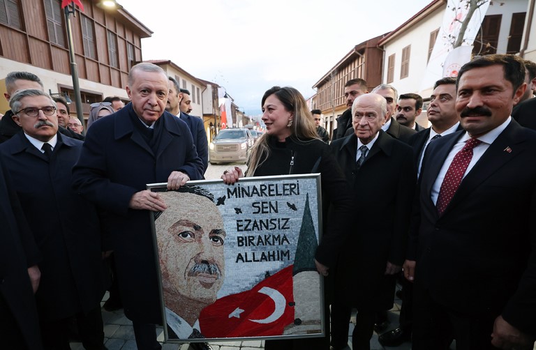 TBMM Başkanı Numan Kurtulmuş ve MHP Genel Başkanı Devlet Bahçeli’nin de eşlik ettiği Cumhurbaşkanı Erdoğan, yetkililerden binanın tarihçesi ve yürütülen çalışmalar hakkında bilgi aldı.
