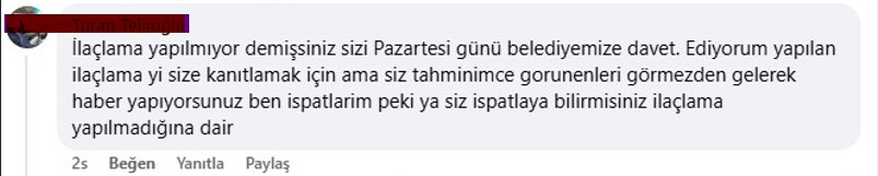 Haber sonrası Sosyal Medya üzerinde cevap yazan Belediye İlaçlama sorumlusu “Buyurun çalışmalarımızı anlatalım” derken bir diğer ilaçlama görevlisi de “ İlaçlama yapmadığımızı ispat edebilir misiniz?” şeklinde cevaplar yazmıştı.