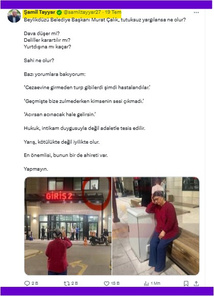 AK Parti MKYK eski Üyesi ve Gaziantep Milletvekili Şamil Tayyar Beylikdüzü Belediye Başkanı Murat Çalık ile ilgili sosyal medya hesabından yaptığı açıklama da, “Hukuk, intikam duygusuyla değil adaletle tesis edilir” dedi.