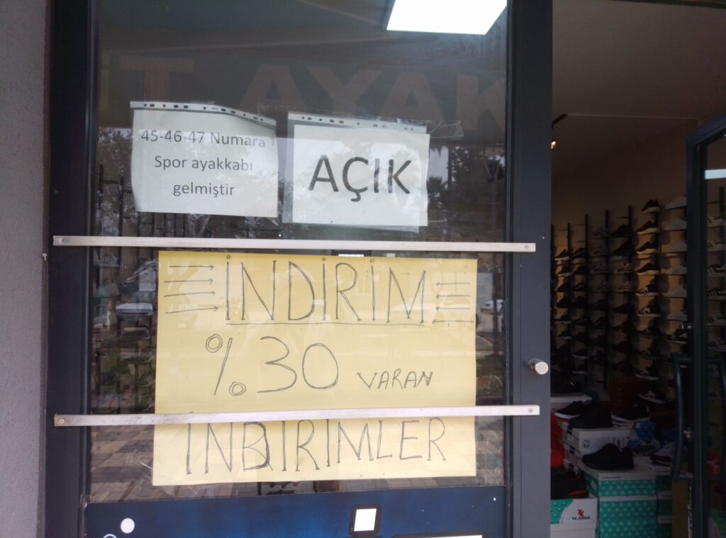 Yaşanılan Deprem sonrası satışları biraz olsun canlandırabilmek adına bazı esnaflar camekanına “İndirim” rakamları yazarak müşteri potansiyelini arttırmaya çalışıyor.