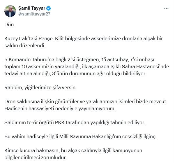 AK Parti MKYK Eski Üyesi ve Gaziantep Milletvekili Şamil Tayyar Sosyal Medya Hesabından Türk Askerlerine yönelik Saldırı düzenlendiğini iddia etti.