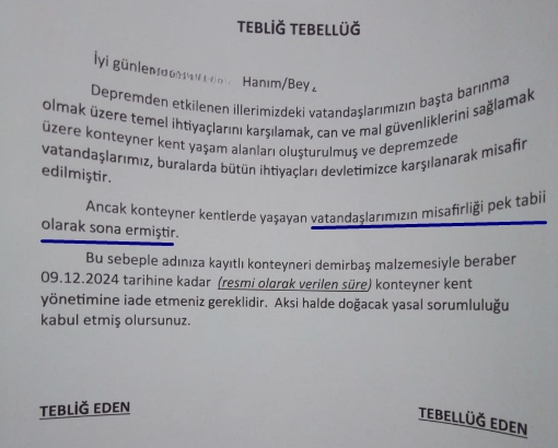 Yapılan tebligatta Vatandaşlarımızdan ikame ettikleri yerleri boşaltmaları istenerek “Vatandaşlarımızın misafirliği pek tabii sona ermiştir” denildi.